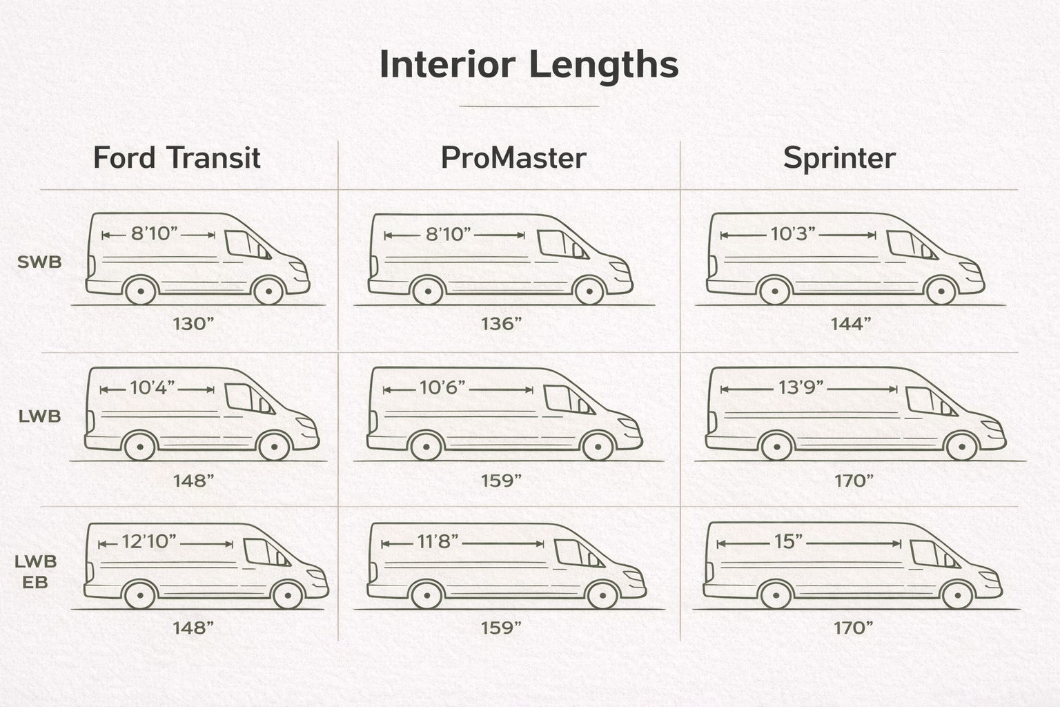 Your van platform and wheelbase affect interior space, system capacity, and overall build cost.
